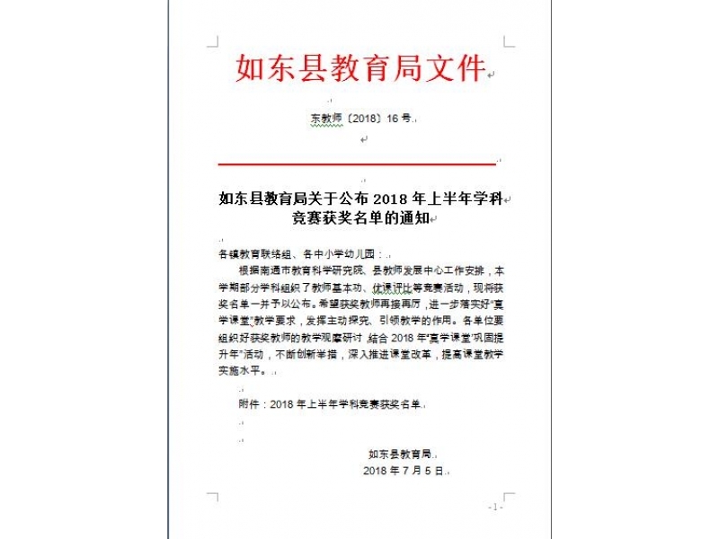 根据南通市教育科学研究院、县教师发展中心工作安排,2018年上半年部分学科组织了教师基本功、优课评比等竞赛活动,我校数学组惠敏敏等同志荣获一等奖,其他获奖名单见文件。特发喜报,以资鼓励。