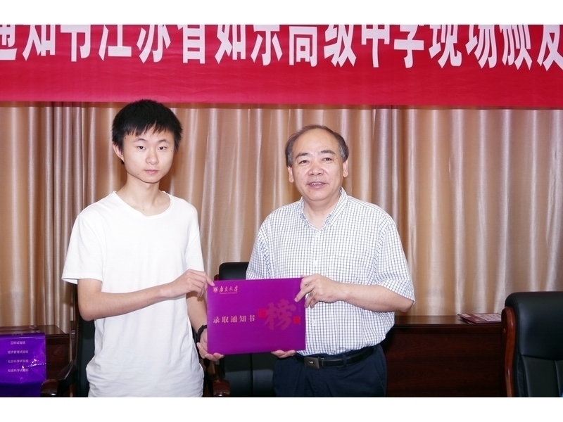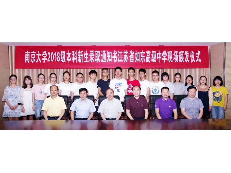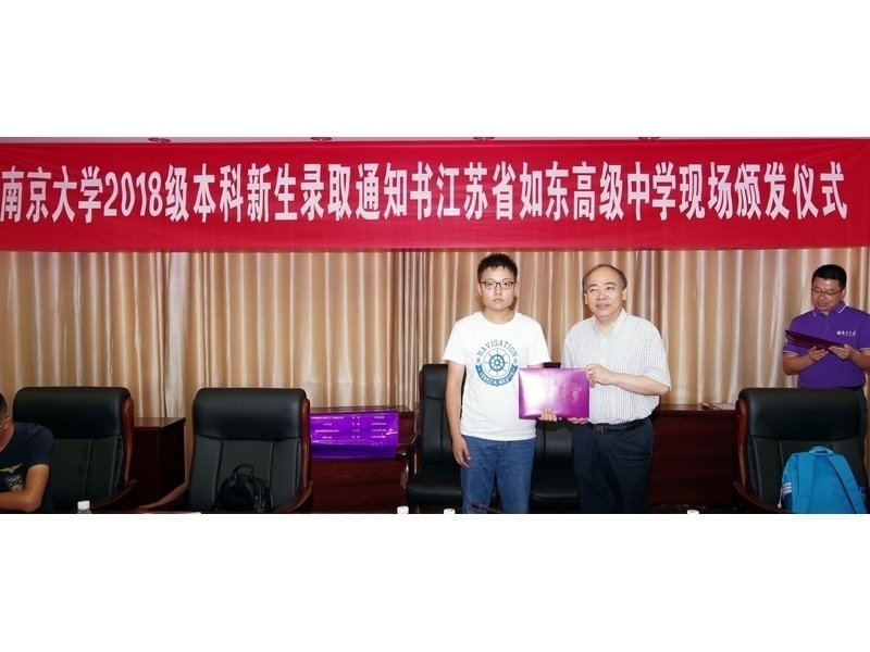 7月24日上午,南京大学党委常委、副校长王志林、学生工作处副处长李浩一行专程从南京驱车赶到江苏省如东高级中学,为我校陈熠等录取南大的2018届新生颁发录取通知书。如东高级中学校长王继兵、党委书记张必忠、副校长马蔚、校办主任殷飞、录取南大的18位学生与家长参加了颁发仪式。