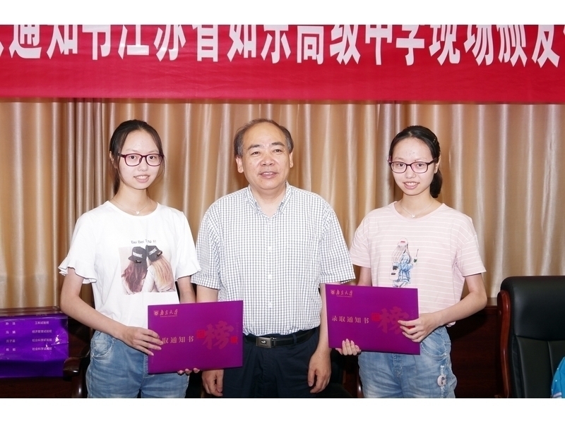 南京大学王志林副校长向我校发放了2018年录取喜报,他代表南京大学感谢我校多年来向南京大学输送了一批又一批的优秀学子,并热忱欢迎18位新同学就读南大。随后,王志林副校长向18名同学一一发放了录取通知书。其中,刘梦蛟和葛书虬是孪生姐妹,两人分别以392分和402分的高分被南京大学录取。拿到录取通知书,两姐妹十分开心。
