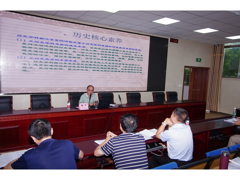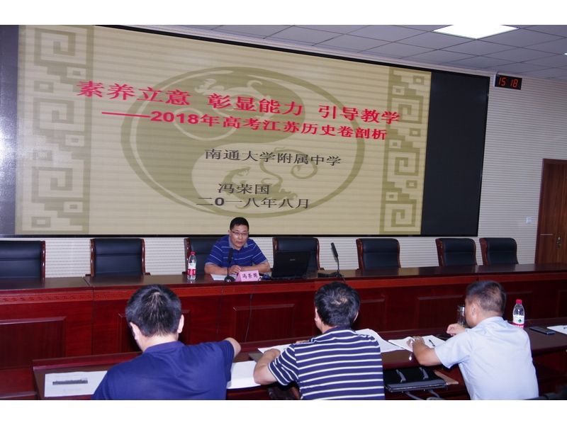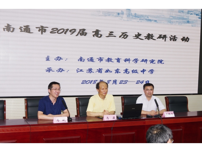 市教育科学研究院马斌老师主持活动,总结了南通市2018届高三历史教学工作,并就2019届高三历史教学的策略问题提出了具体要求。如东县马塘中学徐文彬老师以《用阅读拉近教学与高考的距离——近几年江苏历史主观题剖析》为题,介绍了教学研究经验,南通大学附属中学冯荣国老师、通州区教师发展中心徐新老师分别做了题为《素养立意、彰显能力、引导教学》、《高中历史学科素养与近三年江苏历史高考题》的专题讲座。
