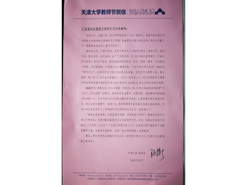 在教师节到来之际天津大学给我校发来贺信