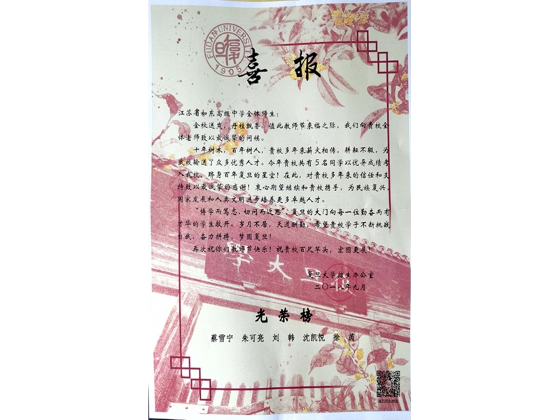 复旦大学给我校发来喜报