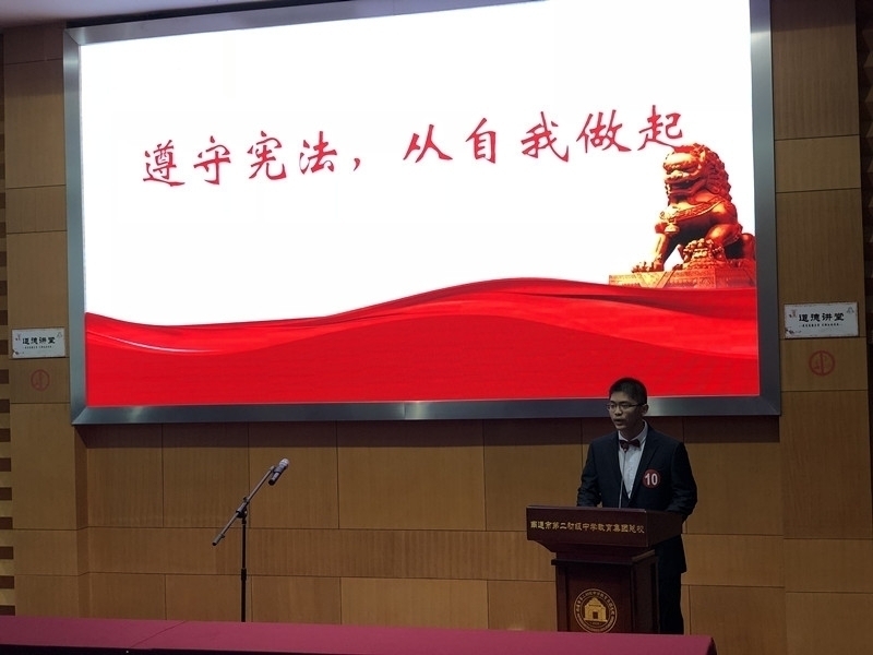 比赛分主题演讲、现场问答和现场选题即兴演讲三个部分组成,南通市高中组共有17支代表队参加,市区的南通中学、南通一中、南通大学附属中学等名校派出优秀选手参加比赛,赛场可谓强手如林,每一个参赛选手都准备充分。他们围绕“学宪法 讲宪法”主题进行了热情洋溢的演讲,用激情饱满的语言讲述了发生在他们身边的关于宪法的故事,阐述了对宪法的认知与理解。选手们时而激情昂扬,时而理性说法,声情并茂,抑扬顿挫的精彩演讲不时获得观众和评委老师的热烈掌声。赵城煜同学29日下午第10个出场以出色的表现力,精彩的演讲内容在第一环节就脱颖而出。接下来的现场问答环节更是扣人心弦,面对前面选手的连连得分,赵城煜同学顶住压力,大胆选题,凭借丰富的宪法知识和镇定从容的临场发挥,获得了这个环节的高分。