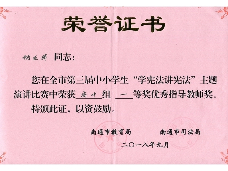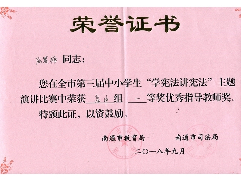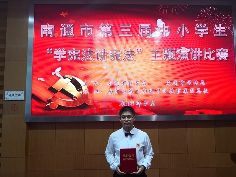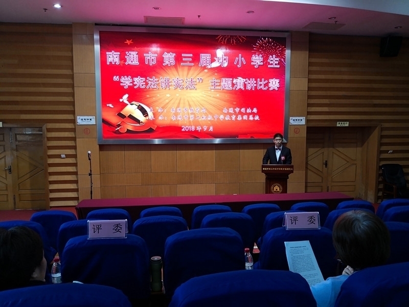 为进一步深入开展宪法教育,引导广大青少年学生尊崇宪法和法律,弘扬宪法精神,增强法治素养,在9月29日-30日,南通市教育局举行了南通市第三届中小学生“学宪法 讲宪法”主题演讲比赛活动。比赛由南通市教育局、南通市司法局联合主办,南通市第二初级中学承办。本次比赛分为高中(包括职中)、初中、小学三个组别进行,我校高二(2)班赵城煜同学代表如东县高中组参加了比赛。