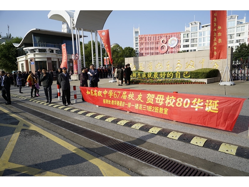 校门口,“江苏省如东高级中学”这几个大字均已重新出新,散发出别样的光辉。校园里,彩旗招展,花团锦簇,处处洋溢着浓厚的节庆氛围。80年来,如东中学培养出一批又一批优秀毕业生,他们岗位不同、成就各异,但此时回到母校,他们都有了同一个身份——光荣的如东中学校友。