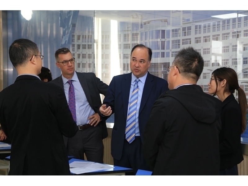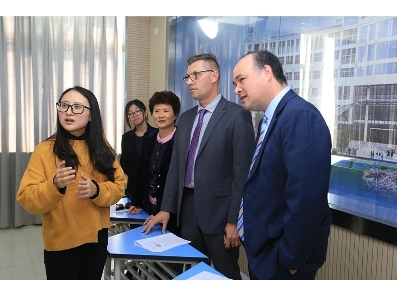 11月1日上午,美国加州洛杉矶蒙罗维亚联合学区Mr. Bryan Wong 布莱恩•王,MUSD Broad Member and Former Broad President 学区董事,前任董事会会长.Ms.Connie Wu 康妮•吴, AssistantSuperintendent of Business, Monrovia教育局副局长国际交流及商务总监. Dr. Geoffrey Zamarripa 杰弗里•扎马里帕, Santa Fe Middle School Principal, Santa Fe中学校长。邓佳昕,苏教国际美国中心教育顾问等一行5人来我校进行交流访问。