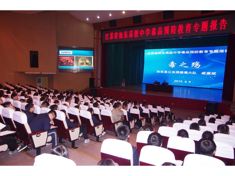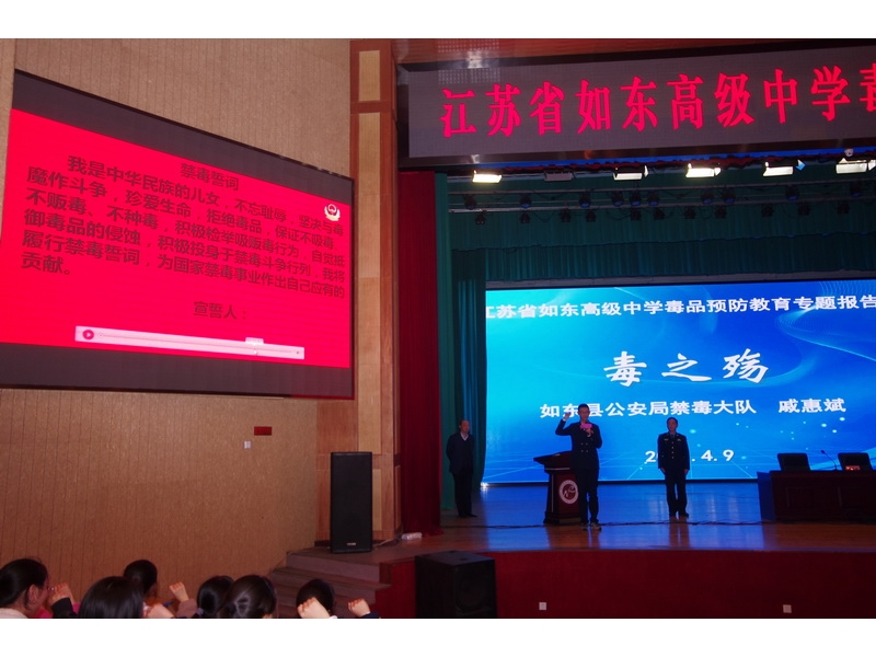 本次活动邀请到如东县公安局禁毒大队戚惠斌副大队长作主题报告。活动通过图文并茂的课件、鲜活具体的案例深入浅出的讲述了毒品常识、毒品危害、目前国内外毒品形势、中学生应该如何预防和远离毒品等知识。重点引导青少年学生正确认识毒品、自觉远离毒品、有效遏制毒品,有效提高青少年学生识毒、拒毒、防毒能力。此次禁毒宣传活动,既是一次常识教育,又是一次精神洗礼,对帮助学生树立正确的人生目标,营造积极向上、文明健康的校园文化氛围具有重要的意义。