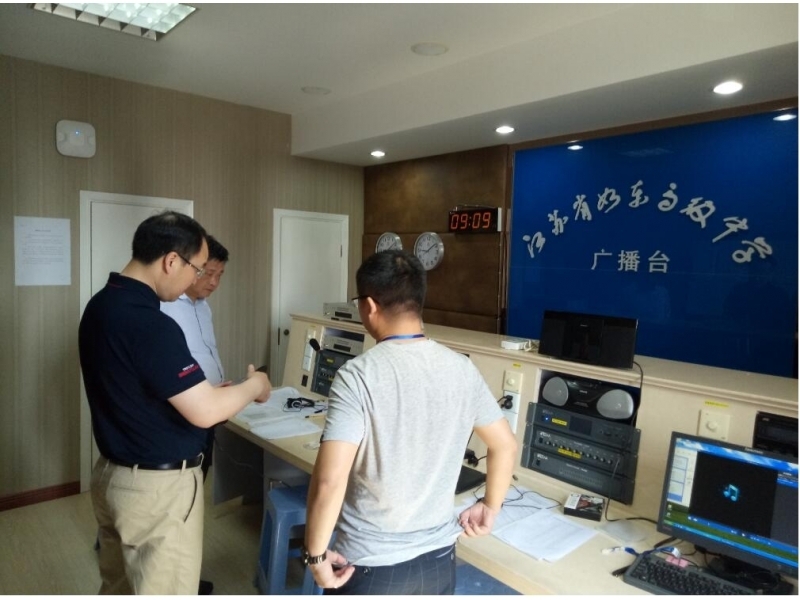 在播音室,于局长详细了解英语播音工作流程及准备工作,和播音组工作人员了解设备运行状况。于局长、王校长等来到试听教室,实地试听播音效果,并对考点外语听力播音系统、电力和广播线路进行逐一检查。于局长强调,外语考试开始之前,播音组要利用播放信号带的机会,检查外语听力设备的播放效果,确保听力播音系统处于良好工作状态。