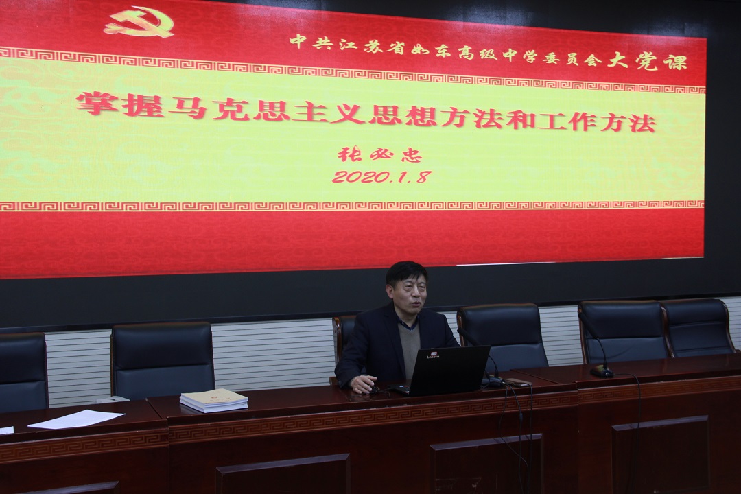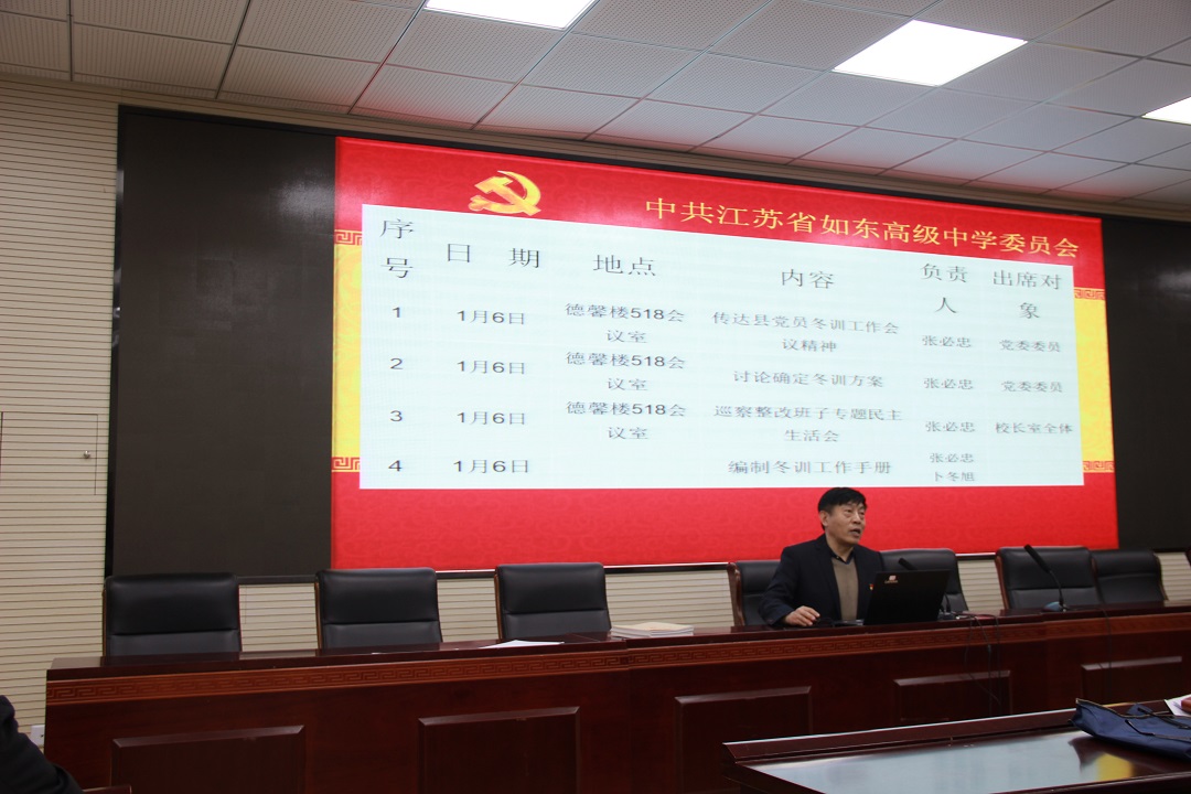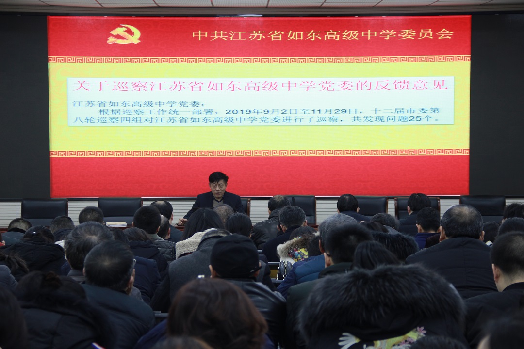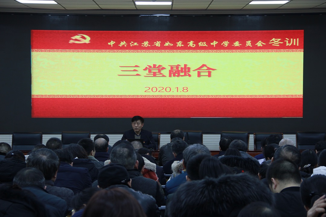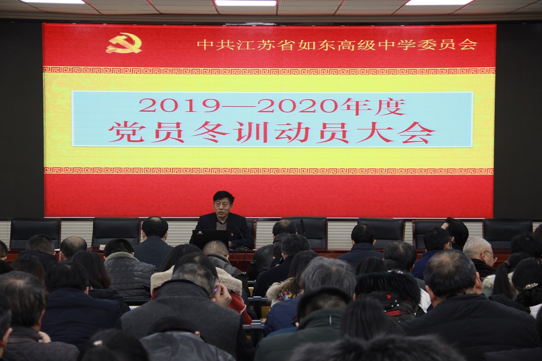 1月8日晚,学校党委在图书馆一楼阶梯教室组织召开党员冬训动员大会。大会分四项议程:一是党委张必忠书记部署2019-2020年度党员冬训工作,学校党委以2020年1号文件公布了年度党员冬训工作方案,张书记就冬训工作指导思想、冬训时间、领导小组、培训专题、工作要求、冬训形式、具体工作部署和工作要求等做了详细解读;二是张必忠书记传达南通市委巡察办《关于巡察江苏省如东高级中学党委的反馈意见》,就十二届南通市委第八轮巡察四组驻点我校巡察期间发现的问题和提出的意见建议进行了传达,并提出整改要求;三是举行了冬训“三堂融合”活动,张必忠书记上大党课《掌握马克思主义思想方法和工作方法》,从“坚持实事求是、坚持战略定力、坚持问题导向、坚持全面协调、坚持底线思维、坚持调查研究、坚持抓铁有痕、坚持历史担当”等八个方面,为全体党员辅导如何掌握马克思主义的思想方法和工作方法,勉励全体党员要不忘教育初心,牢记育人使命;四是分支部进行活动,文科第一支部、文科第二支部、理科第一支部、理科第二支部分别进行了换届选举,选举产生了新一届支委会。