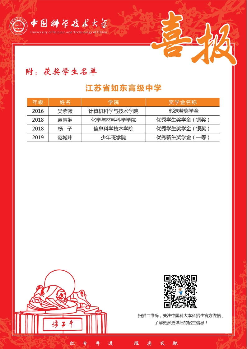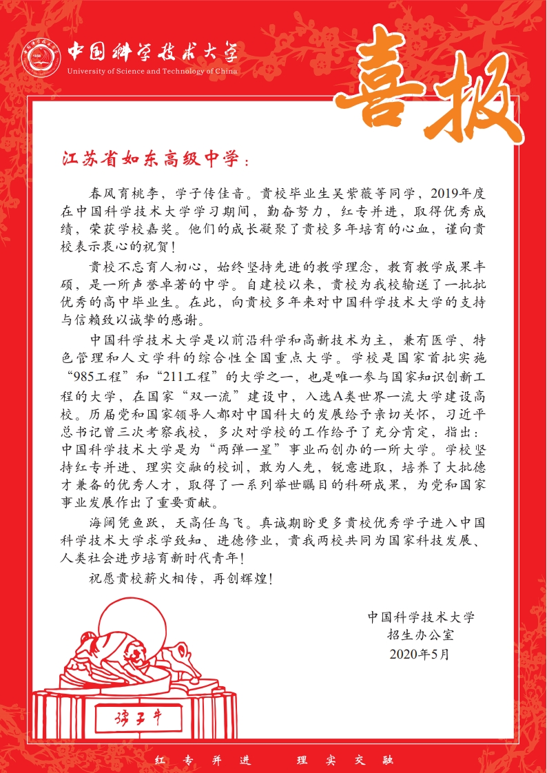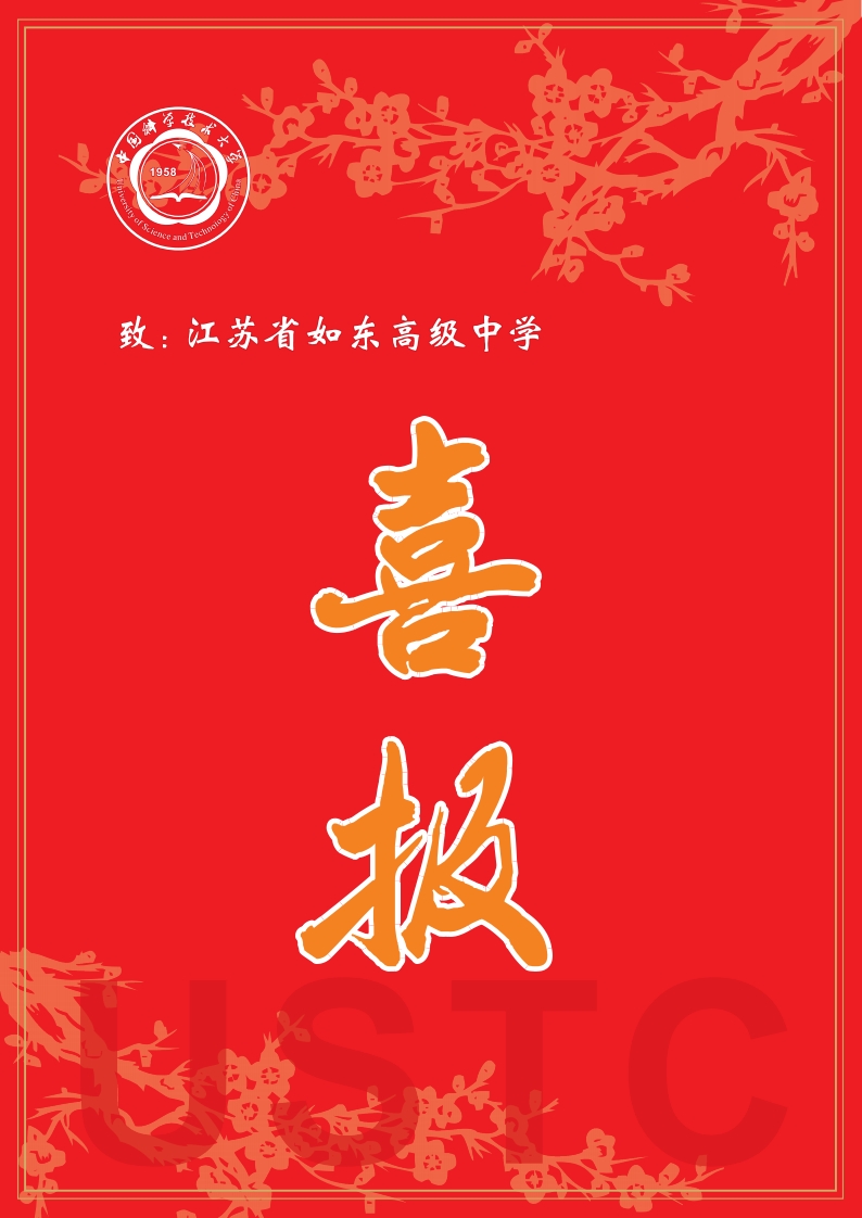 中国科学技术大学给我校发来喜报