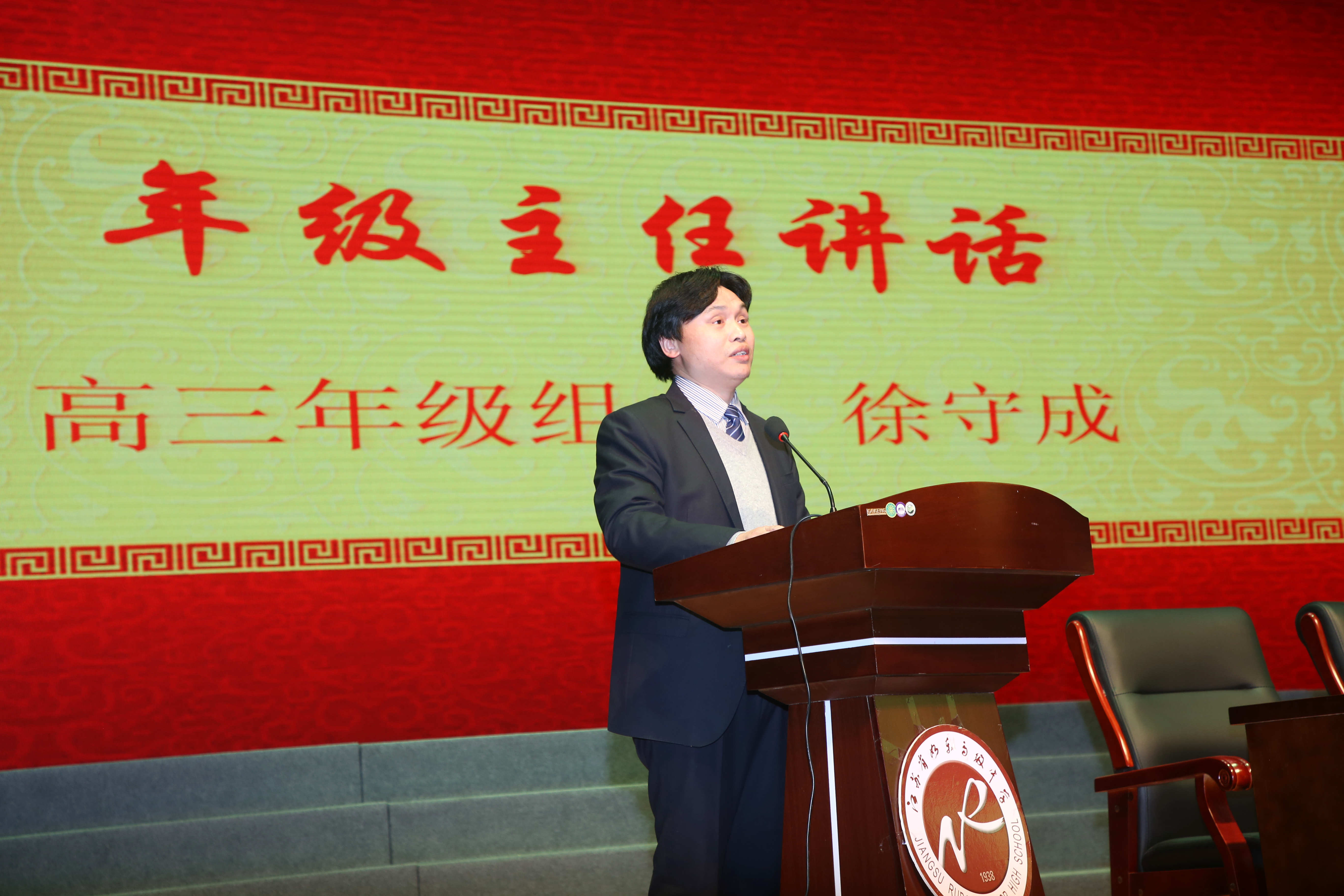 高三年级徐守成主任发表讲话,他的讲话中充满了对高三全体师生的祝福与期盼,表达了老师、家长和同学们一起并肩作战,拼搏高考的决心,也对全体高三学子提出了希望,愿大家在漫长又短暂的百日奋战中,用清晰的目标指引方向、用科学的方法指导学习、用勤奋的态度提升成绩、用信念支撑锻造辉煌的每一天。