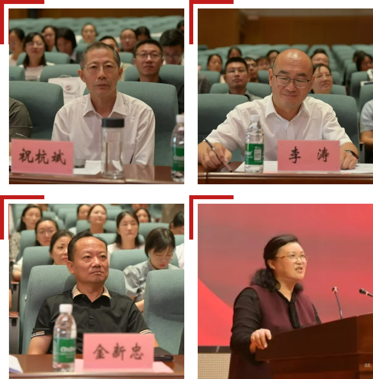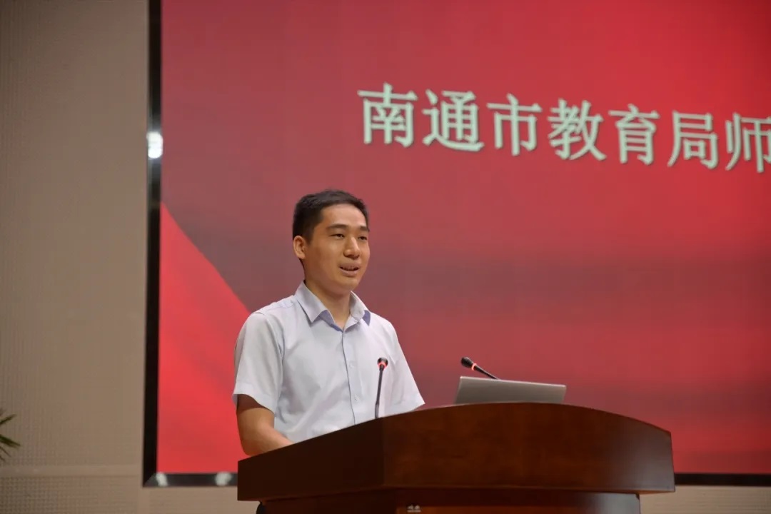 南通市教育局师资处副处长任海宽讲话。他对名校长、名师工作室的成立表示热烈的祝贺。任处长指出:“教师是立教之本、兴教之源,强国必先强教,强教必先强师。”南通教育始终把建设一支“道德优美、学术纯粹”的教师队伍作为推动教育高质量发展的重要举措,四个工作室揭牌标志着我市名师(名校长)队伍又增添了一支新的“生力军”,为弘扬教育家精神提供有力支撑,也为引领我市优秀教师竞相成长提供有效平台。他期望:名校长、名师工作室要加强思想政治建设,注重党建引领和理想信念教育;要涵养师德师风,陶冶道德情操和高尚品质;要深化课程改革,提升专业素养和育人智慧;要优化团队管理,凝聚发展合力和创新动力;要优化团队管理,凝聚发展合力和创新动力;要坚持弘道追求,形成特色品质与文化品牌。