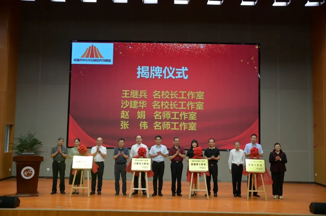 南通市教育局师资处任海宽,南通市名师培养导师团王笑君、郭志明、袁炳飞、祝杭斌,如东县教体局李涛、金新忠,如东县教师发展中心葛家梅等市县领导共同为王继兵名校长工作室、沙建华名校长工作室、赵娟名师工作室、张伟名师工作室隆重揭牌。