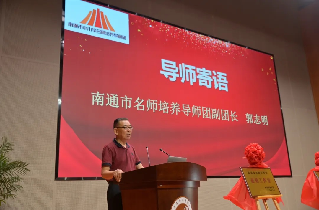 南通市名师培养导师团副团长郭志明代表导师团殷切寄语。郭团长指出,四个名师工作室的成立,既是对以往成绩的肯定,更负有光荣使命和责任。他希望工作室能以李吉林和李庾南老师为榜样,扛起情境教育大旗,确立明确教育主张、做好科研课题、带好工作团队,辐射区域教育、惠及一方学生。他强调,要使工作室成为名师成长的科研站、孵化器,实现高品质发展;工作室要全面加强创新创优创品牌、育师育生育项目、扩容扩员扩影响,打造品牌特色,在省市区乃至全国产生深远影响,充分发挥工作室辐射引领、改革推动、科研推动的作用。