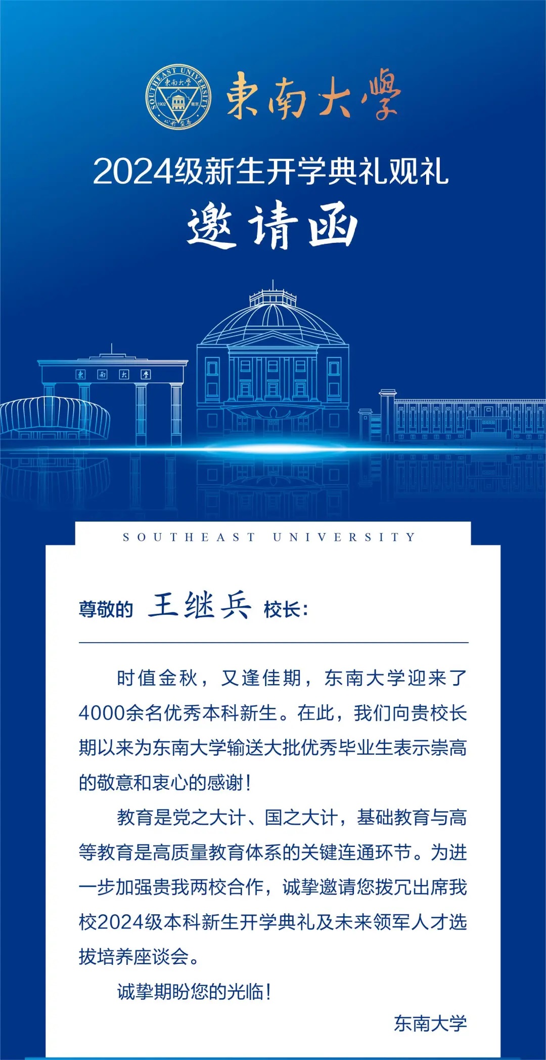 我校党委书记、校长王继兵应邀参加东南大学2024年开学典礼