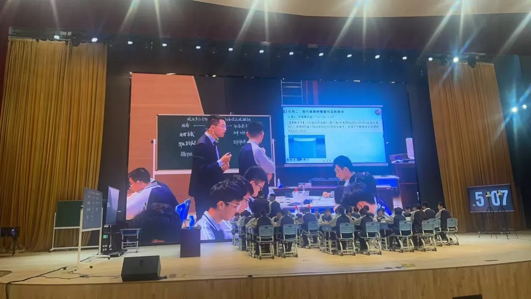在教练团队的悉心指导下,季雨豪老师不断优化课堂设计,大胆采用项目化学习方式进行复习课教学,通过创设工业生产实际问题情境,引导学生深入探究硫及其化合物的转化。最终在赛场上游刃有余,为学校争得荣誉。