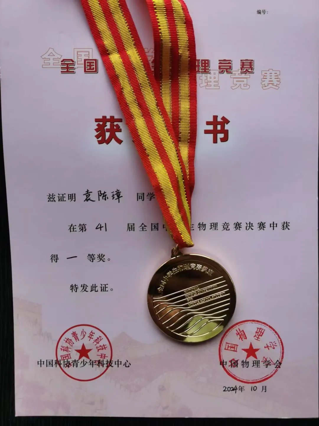 在刚刚结束的第41届全国中学生物理竞赛决赛中,我校高三年级袁陈璋同学以江苏省第四名的成绩荣获一等奖,勇夺金牌!