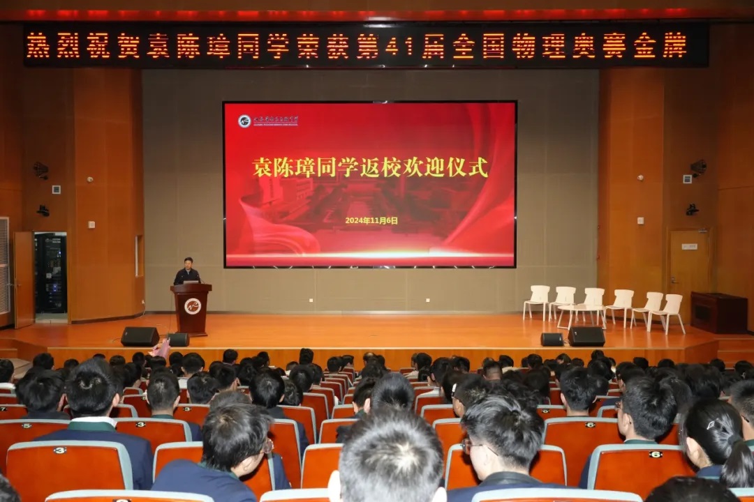 11月6日下午,第41届全国中学生物理竞赛决赛金牌得主、高三年级袁陈璋同学返校欢迎仪式在学校江风馆北报告厅举行。校长室、年级组负责同志和部分师生代表参加活动。仪式由教务处主任吴正飞主持。
